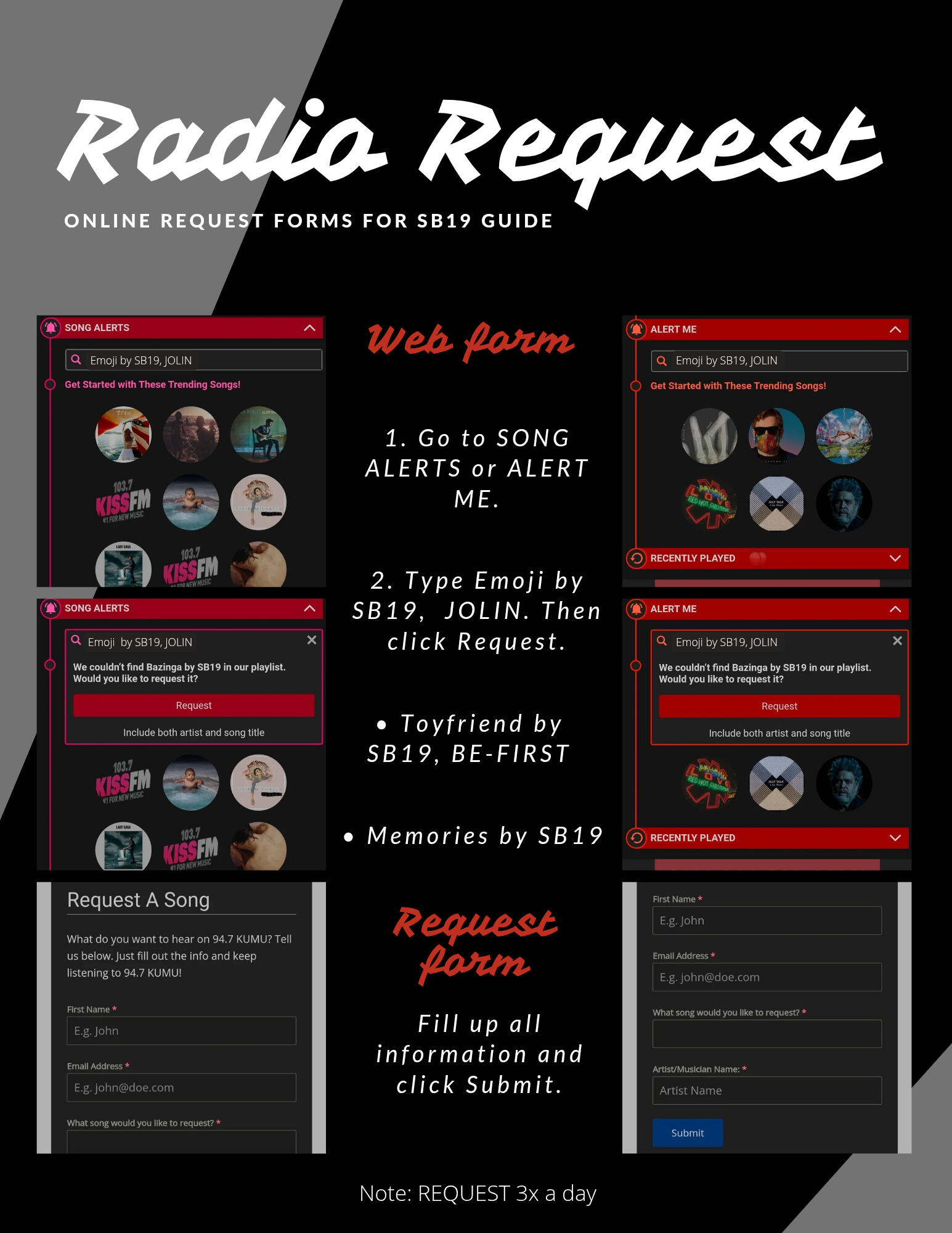 PANDORA CHECKLISTArtist station adds: Add SB19 stationTrack station adds: Create a station for each SB19 songRadio Spins: Listen to SB19 songs when they come on the stations; you may skip songs until you get an SB19 track (Premium users have unlimited skips)Thumbs up: Give a thumbs up to all SB19 songs played on the artist or track stationRadio replay: Replay SB19 songs (Premium users have unlimited replays)