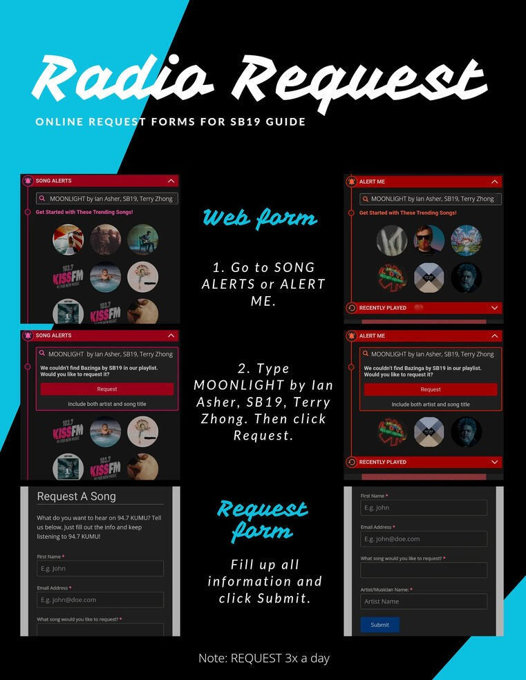 PANDORA CHECKLISTArtist station adds - add SB19 stationTrack station adds - create a station for each SB19 songRadio Spins - listen to SB19 songs when they come on the stations; you may skip songs until you get an SB19 track (Premium users have unlimited skips)Thumbs up - give a thumbs up to all SB19 songs played on the artist or track stationRadio replay - replay SB19 songs (Premium users have unlimited replays)